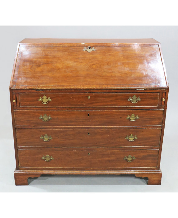 Ribalta il legno di mogano, calatoia con all'interno otto cassettini, uno sportellino centrale e piano in pelle, quattro cassetti inferiori. Inghilterra, sec. XVIII. cm108x107x53 (difetti)