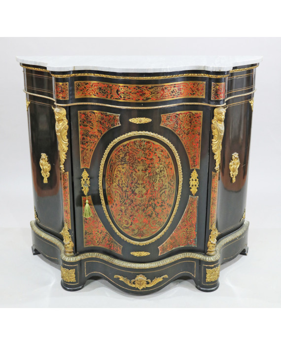 Credenza boulle in legno ebanizzato ed intarsiato a volute in metallo dorato e finta tartaruga, uno sportello, fronte e laterali bombati, cariatidi laterali in bronzo dorato, piano in marmo. Francia, Napoleone III. cm111x12643 (difetti e mancanze alle filettature)