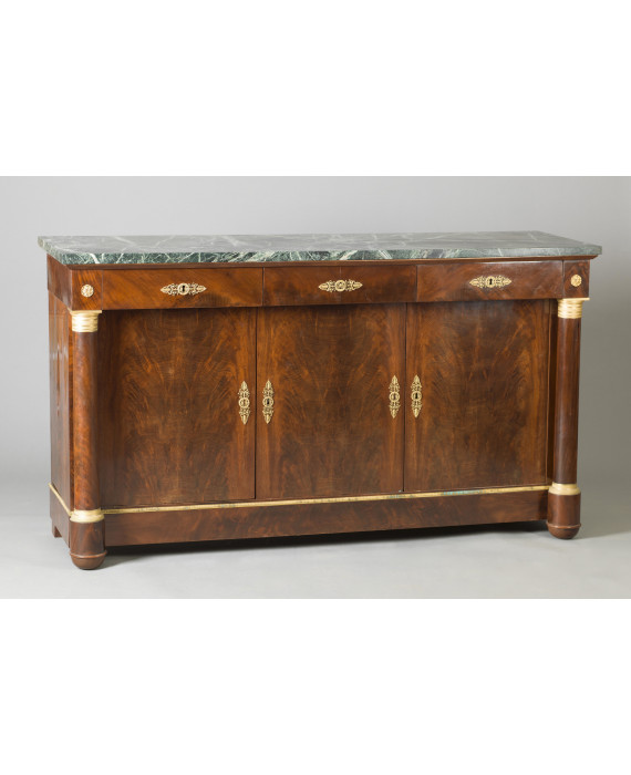 Credenza impiallacciata in legno e piuma di mogano, tre cassetti, tre sportelli inferiori, colonnine laterali con basi e capitelli in bronzo dorato e cesellato, piano in marmo. Francia, sec. XIX. cm94x168x51