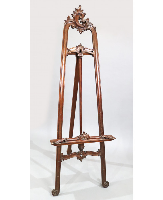 Cavalletto da pittore in legno di mogano intagliato a volute. Alt. cm175 (difetti)