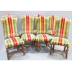 Gruppo di otto sedie in legno di noce, gambe e traverse tornite, seduta e spalliera rivestite in velluto (lievi difetti)