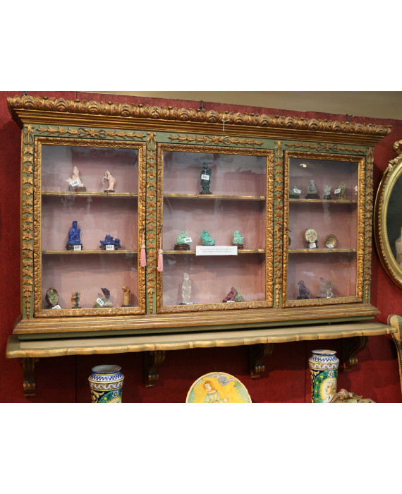 Lotto di un'antica credenza pensile a tre sportelli in legno dorato e laccato verde ed una mensola in legno dipinto di epoca posteriore. cm28x190x32; cm102x188x26