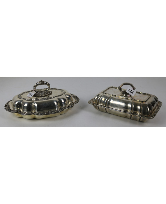 Lotto di due legumiere in argento 800, una a corpo liscio, una lavorata a volute e fiori. Peso tot. gr. 2880
