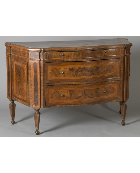 Comò scantonato lastronato in radica di noce con riquadri in legno di ciliegio, tre cassetti, due sportelli laterali, gambe piramidali. Italia, sec. XVIII. cm85x134x52 (piccole mancanze)
