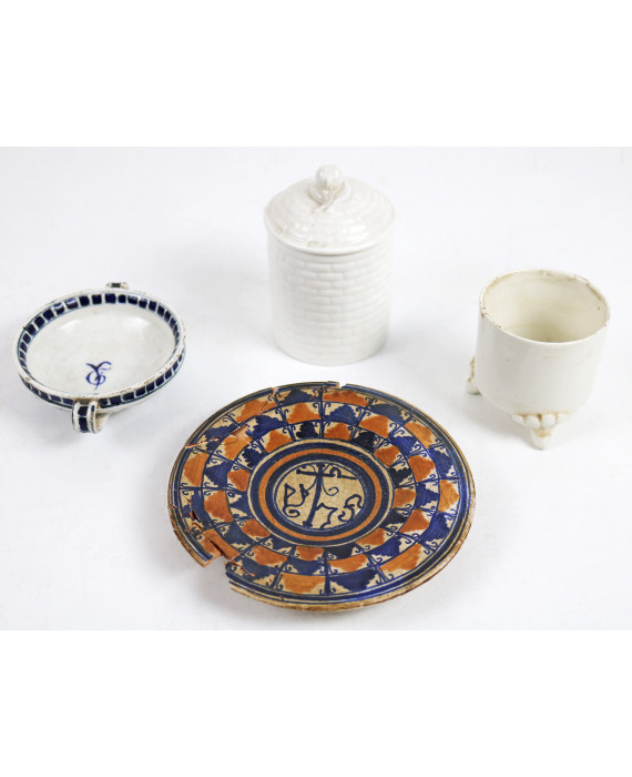 Lotto di una ciotola biansata in maiolica firmata sul fondo Viterbo 1926, una zuccheriera e un contenitore in ceramica bianca marcata Bassanello ed un piattino in terracotta smaltata, manifattura Le Ceramiche Tuscania (restauri e scheggiature al piattino)