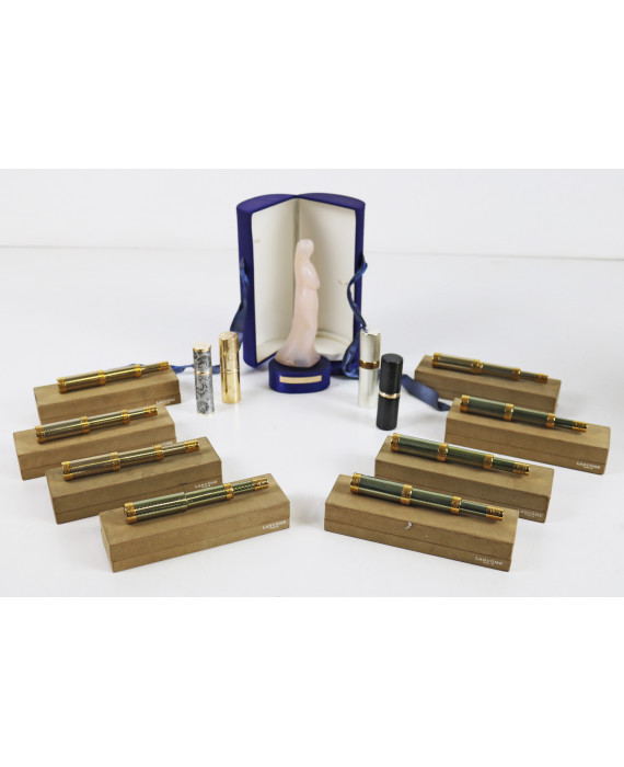 Lotto di una bottiglia di profumo a forma di donna Magie de Lancome in vetro lattimo con custodia in raso e 12 porta rossetti francesi in metallo, di cui otto con custodia