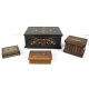 Lotto di quattro scatole in legno intarsiato, tra cui una di manifattura sorrentina a forma di libro ed una in legno ebanizzato con intarsi in osso e madreperla (difetti e mancanze)