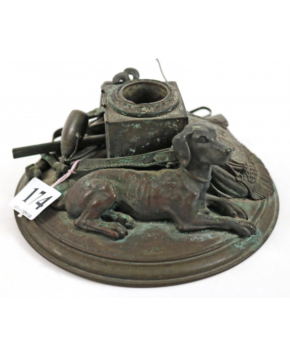 Calamaio in rame sbalzato con trionfo di caccia e cane accucciato, della fine del sec. XIX. Diam. cm17 (mancanze e difetti)