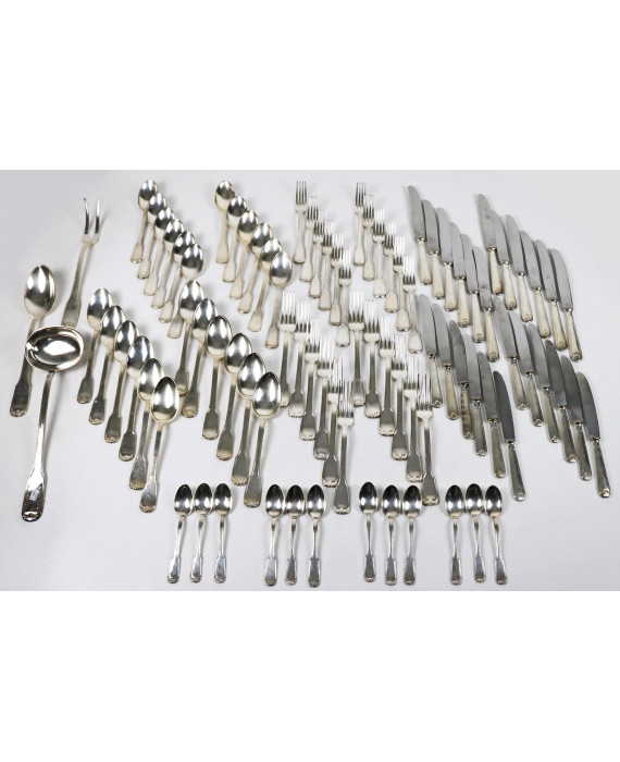 Servizio di posate in metallo argentato, composto da 12 forchette, 12 cucchiai e 12 coltelli, 12 forchette, 12 cucchiai e 12 coltelli piccoli, 12 cucchiaini e tre posate di servizio