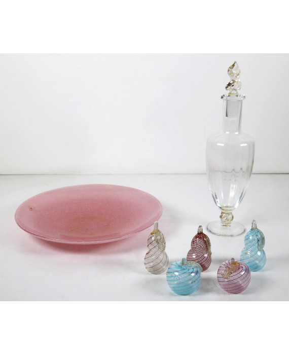 Lotto di un piatto in vetro rosa firmato Barovier & Toso, una bottiglia in vetro trasparente firmata alla base e cinque vetri di Murano a forma di frutta . Diam. cm37; Alt. cm43; Alt. cm11(3)/7(2)