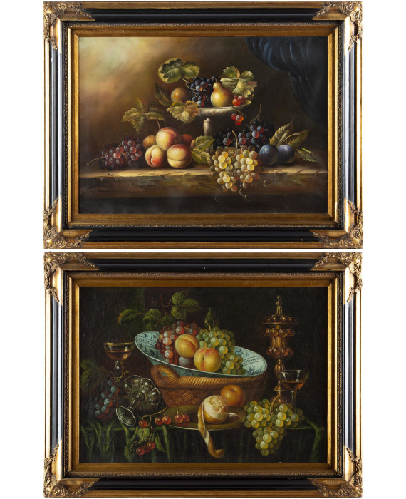 Coppia di dipinti decorativi ad olio su tela raffiguranti nature morte con frutta, con cornici