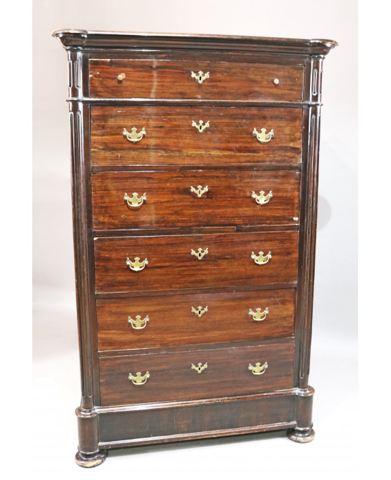Cassettiera impiallacciata in legno di palissandro, sei cassetti, paraste laterali a colonna. Italia, fine sec. XIX. cm165x104x52 (difetti)