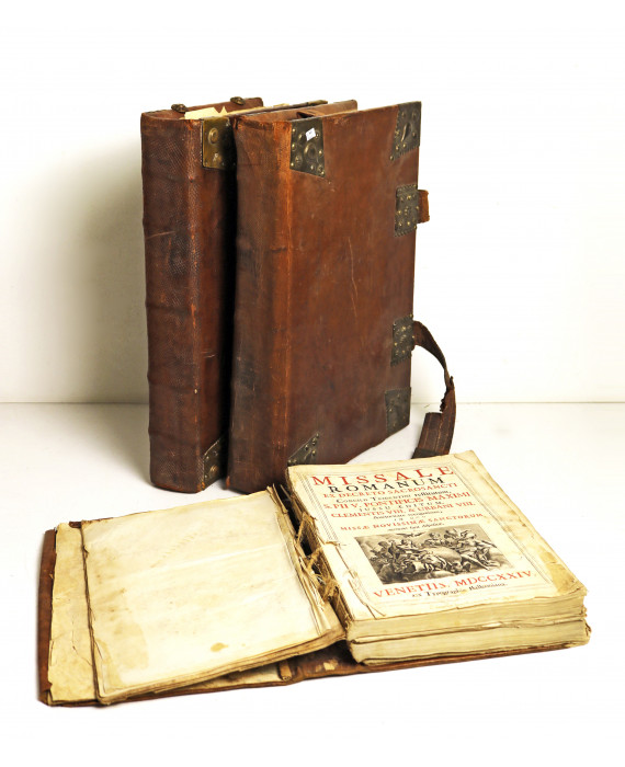 Lotto di tre volumi con coperta in pelle: un messale romano stampato a Venezia, tipografia Balleoniana, 1724 (difetti e mancanze); Officia solemnitatum a psalterio disjuncta et restaura. cum plurimorum sanctorum hyminis collecta. 1861. Opera in due volumi di grande formato con applicazioni in metallo (mancante di fronterspizio, notevoli difetti, restauri e mancanze)