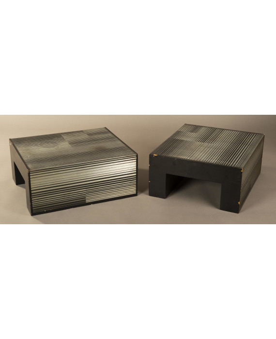 Coppia di particolari tavolinetti in legno ebanizzato con piano e laterali rivestiti da righe in metallo argentato e lacca nera. Design italiano degli anni '80. cm30x70x60 (difetti ed abrasioni)