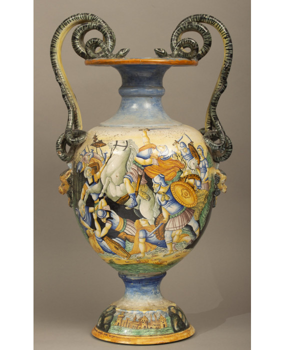 Grande vaso in maiolica interamente dipinto con scene di battaglia e paesaggi, anse a serpente con attacco a testa leonina. Napoli, fine sec. XIX. Alt. cm80 (restauri e mancanza ad un ansa)