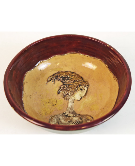 Pietro Melandri (1885-1976). Ciotola in maiolica a fondo verde, rosso ed ocra con figura femminile a bassorilievo centrale, firmata sul fondo. Alt. cm6: diam. cm15
