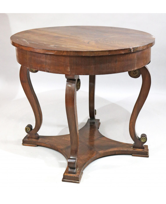 Tavolo tondo in legno di noce, quattro gambe a voluta raccordate da piano a crociera. Italia, sec. XIX. Alt. cm85; diam. cm98