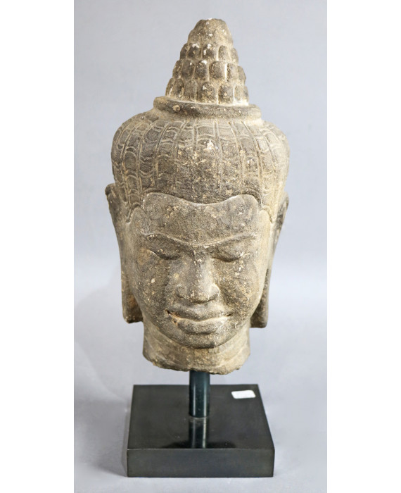 Testa di Buddha in arenaria scolpita, su piedistallo in metallo. Thailandia, sec. XIX. Alt. cm27