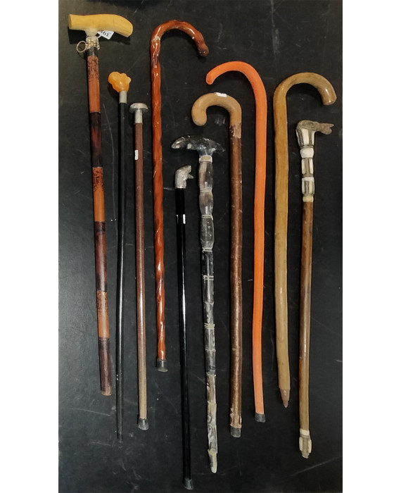 Lotto di dieci bastoni da passeggio da collezione in vari materiali (difetti)