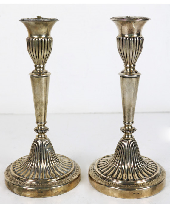 Coppia di candelieri in argento 800 con fasce baccellate. Alt. cm21. Peso tot. gr. 350 (fori alla base)