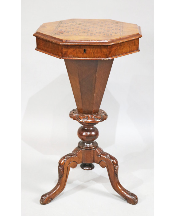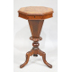 Tavolinetto da lavoro impiallacciato in legno di mogano ed intarsiato a motivi geometrici in bois de rose e bois de violette, piano ottagonale apribile con all'interno numerosi vani, fusto ottagonale e tornito terminante su tre appoggi intagliati a volute vegetali. Italia, sec. XIX. cm74x43x43 (difetti e mancanze)