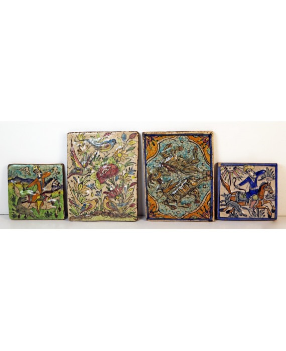 Lotto di quattro placche in maiolica invetriata, dipinta e lavorata a bassorilievo con scene di caccia, uccelli e arieti. Vecchia manifattura persiana. cm18x18(2)/28x22(2)