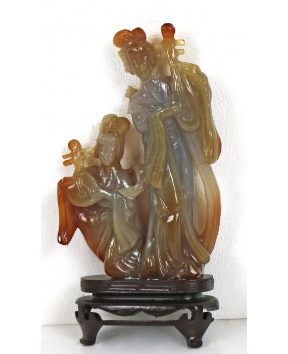 Gruppo in avventurina scolpita raffigurante Guanyin su base in legno. Cina, sec. XX. Alt. cm15 (mancanze e restauri)