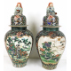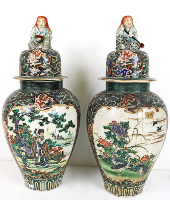 Coppia di vasi con coperchio in porcellana dipinta nei toni del verde con draghi, nembi e paesaggi con personaggi. Cina, inizi sec. XX. Alt. cm53 (filatura ad uno)