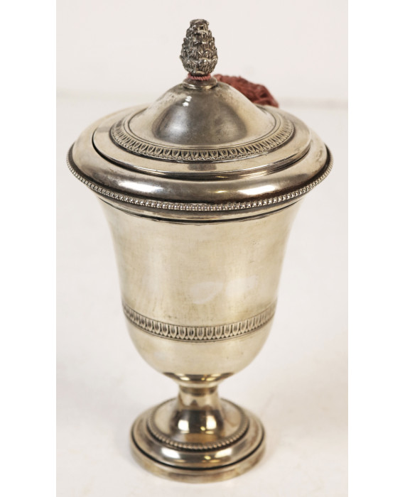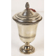 Zuccheriera in argento 800 con fasce perlinate e lavorate a palmette. Alt. cm18. Peso tot. gr 290 (ammaccature e pomolo restaurato)