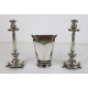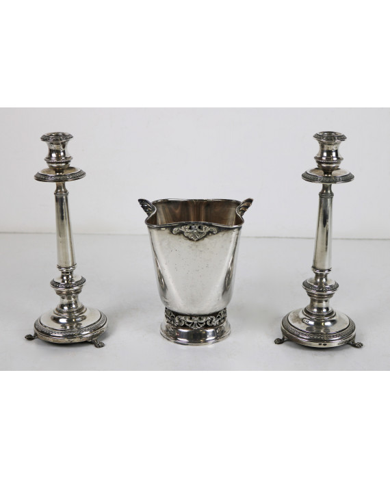 Lotto di tre oggetti in argento 800: un vaso con anse a conchiglie e base traforata ed una coppia di candelieri con fasce incise a greca e tre peducci a zampa. Alt. cm16/24(2). Peso tot. gr. 690