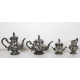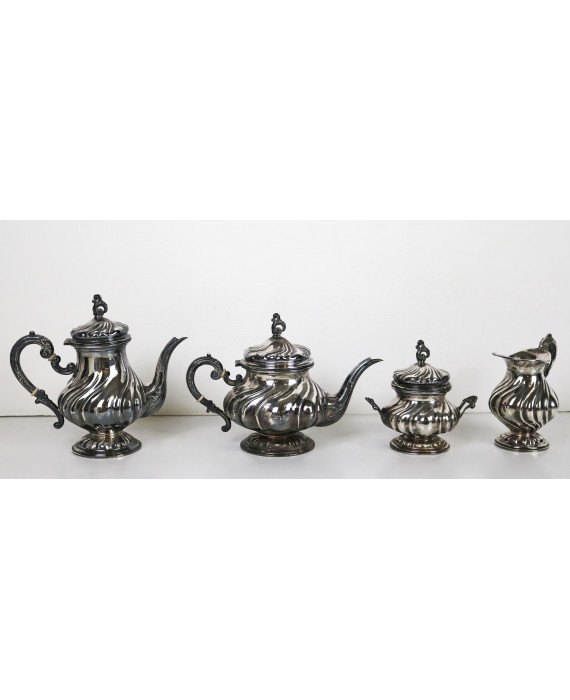 Servizio da tè e caffè in argento 800, corpo costolato, manici a voluta vegetale, composto da teiera, caffettiera, lattiera e zuccheriera. Peso tot. gr. 1070 (lievi difetti)