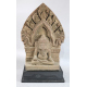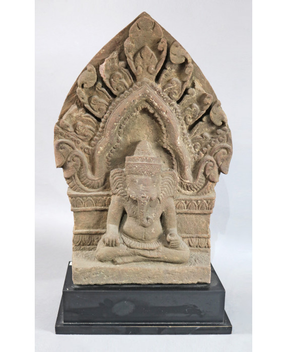 Scultura in arenaria lavorata ad altorilievo, raffigurante edicola con serti vegetali e Ganesh centrale, su base in legno ebanizzato. Thailandia, sec. XIX/XX. Alt. cm55x39x13 (mancanza)