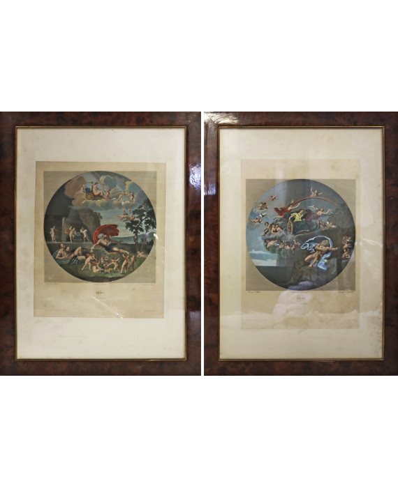 Coppia di incisioni policrome raffiguranti scene mitologiche con Zeus, con cornice. Francia, fine sec. XIX. cm41x34 (lievi macchie)
