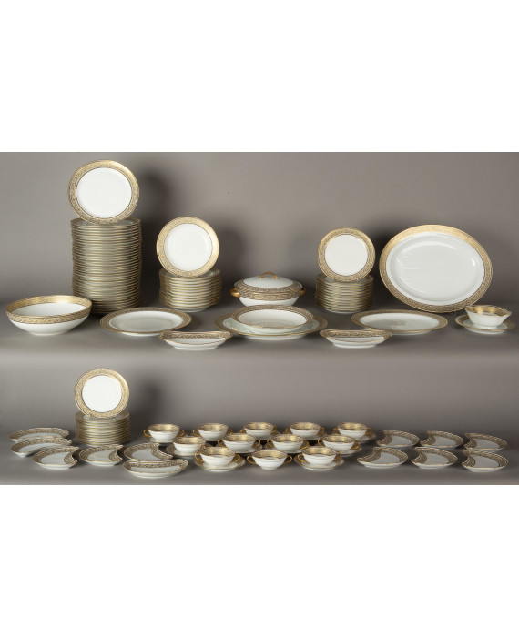 Servizio di piatti in porcellana con tesa decorata in oro a volute vegetali, marcato sul fondo Limoges Bernardaud & C, composto da trentasei piatti piani, dodici piatti fondi, dodici piatti da dolce, dodici piatti da frutta, dodici mezze lune, dodici tazze da consommè con undici piattini, una zuppiera, una salsiera, una insalatiera e sette piatti da portata.