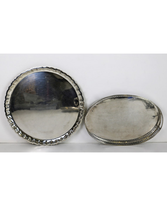Lotto di due vassoi in argento: uno tondo a bordo mistilineo, con bolli 800, argentiere Alignani Pasquale & Alignani Mariano ed uno ovale con ringhierina traforata, con bolli Roma dal 1815 al 1870. Peso tot. gr. 2240