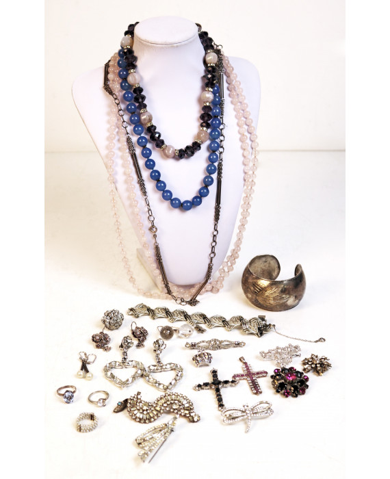 Lotto di quattro collane con chiusura in argento, un bracciale firmato Coro, quattro paia di orecchini con pietre, due croci in argento, un pendente, otto spille tra cui alcune in argento e due anelli.