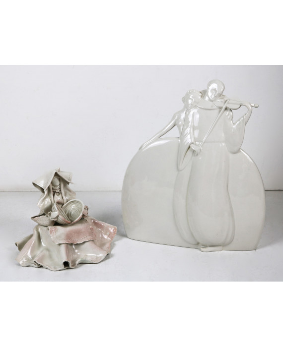 Lotto di un gruppo in ceramica bianca raffigurante scena galante con violino, firmata Coop Ceramica Imola ed una statuina raffigurante donna in abiti sardi firmata G. Sirena. Alt. cm36/18