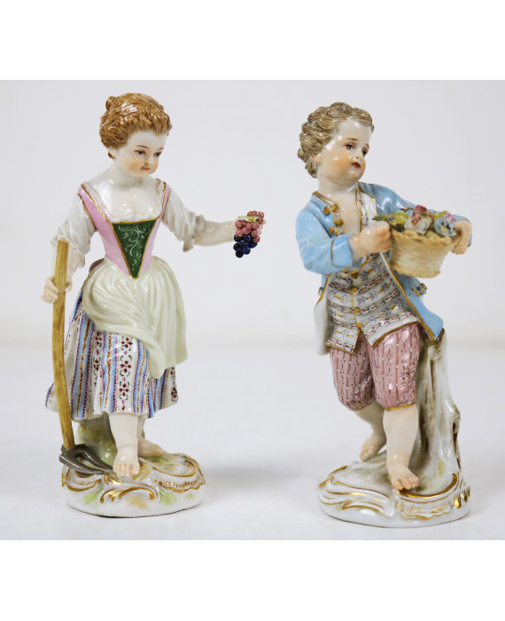 Coppia di statuine in porcellana dipinta raffiguranti contadinelli con cesto di fiori e grappolo d'uva, marcati sul fondo Meissen. Alt. cm13 (lievi mancanze)