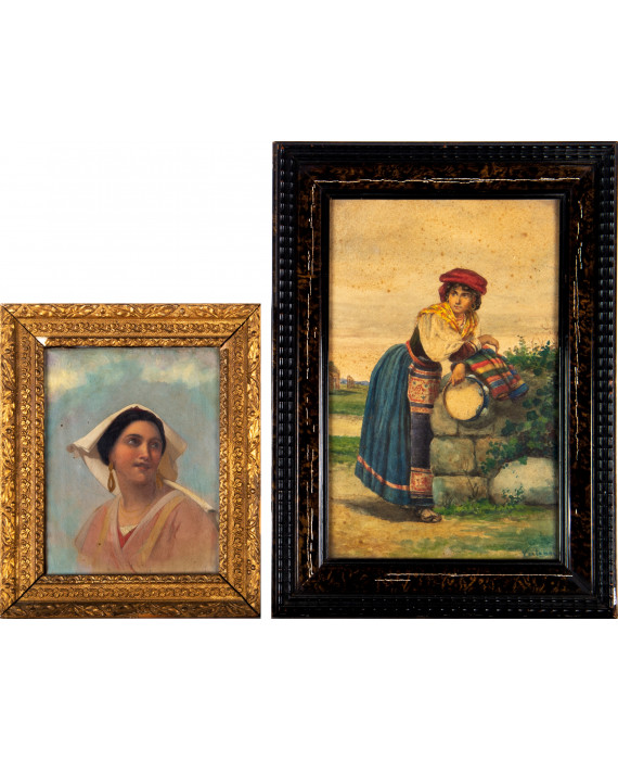 Lotto di due dipinti: Scuola napoletana del sec. XIX. Ritratto di popolana. Olio su tela, con cornice. Vertunni. Popolana con tamburella presso un acquedotto. Acquarello su carta, firma in basso a destra, con cornice (macchie al supporto)