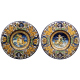 Coppia di piatti in maiolica dipinta con putto alato centrale e tesa con mascheroni e personaggi. Diam. cm29