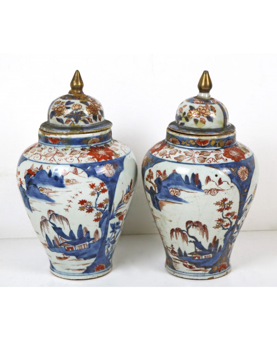 Coppia di vasi con coperchio in porcellana dipinta con paesaggi e fiori. Giappone, inizi sec. XX. Alt. cm27 (restauri e scheggiature)