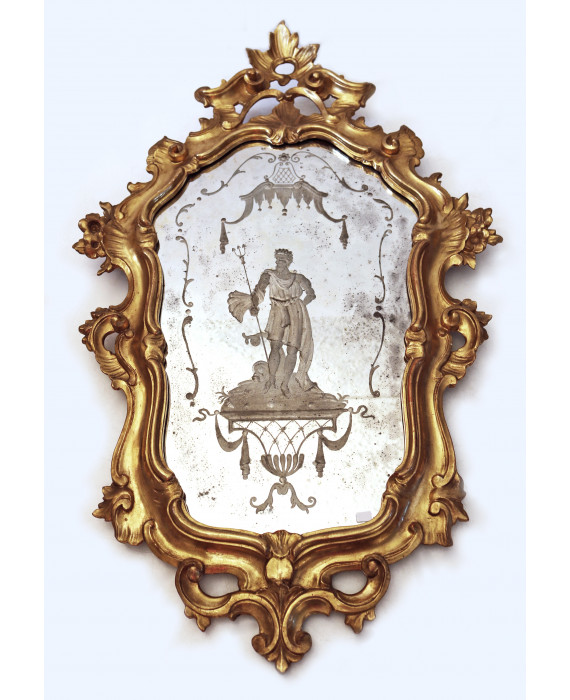 Specchiera in legno dorato intagliata a volute e fiori specchio inciso con dio Nettuno. Italia, sec. XIX. cm90x57