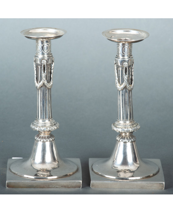 Coppia di candelieri in argento con fusto a colonna decorato con serti di alloro e base quadrata. Bolli Augusta (Germania), inizi sec. XIX. Alt. cm20. Peso tot. gr. 660