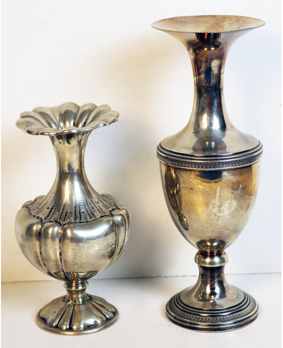 Lotto di due vasi in argento 800. Alt. cm33/24. Peso tot. gr. 875 (ammaccature)