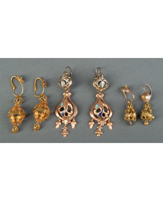 Lotto di tre paia di orecchini: uno in oro 18Kt lavorato in filigrana a forma di sfera e due paia in oro 9Kt. Peso gr. 6,8 (18Kt)/ gr. 16 (9Kt)