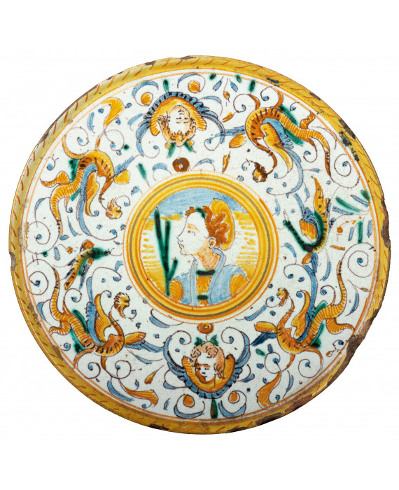 Alzatina in maiolica dipinta in policromia con grottesche e tondo centrale con profilo di Santa martire. Deruta, sec. XVI/XVII. Alt. cm5; diam. cm26 (scheggiature)