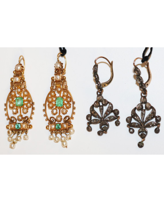 Lotto di un elegante paio di orecchini in oro 9Kt con diamanti taglio antico ed uno in oro 18Kt con smeraldi, perle di acqua dolce. Peso tot. gr. 5,9 (9Kt)/ gr. 8,7 (18Kt). Allegato certificato di autenticità del perito ed esperto, specializzazione preziosi, Federico Perinelli