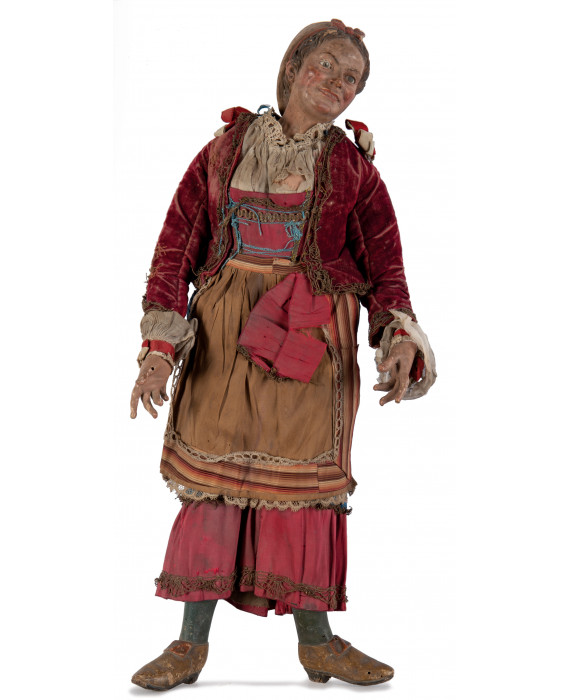Importante statuina del presepe raffigurante personaggio femminile con volto in terracotta dipinta, mani e piedi in legno intagliato, occhi in vetro e abiti in tessuto. Arte napoletana, sec. XVIII. Alt. cm52 (difetti e usure)