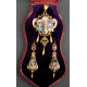 Elegante set composto da un paio di orecchini ed un pendente in oro giallo 18 Kt con miniature in smalti e perle di acqua dolce, con custodia. Peso tot. gr. 21,25. Allegata dichiarazione di autenticità del perito ed esperto, specializzazione preziosi, Federico Perinelli