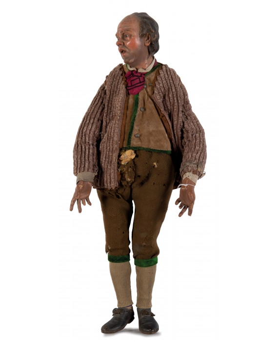 Importante statuina del presepe raffigurante personaggio maschile con volto in terracotta dipinta, mani e piedi in legno intagliato, occhi in vetro e abiti in tessuto. Arte napoletana, sec. XVIII. Alt. cm52 (difetti e usure)
